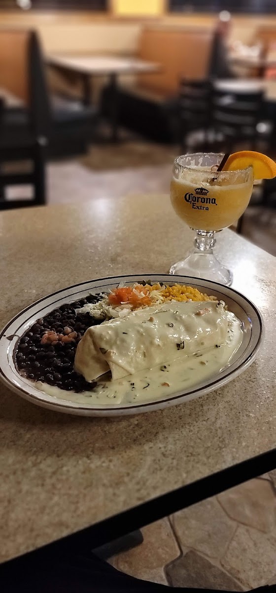This place was busy so I had to try it. Was driving thru and stopped to eat. When I saw this place so busy I figured everything had to be fresh and not sitting. Service was quick and the food was good. I love how they bring free chips and salsa and some whit queso dip, that’s a first normally it’s just salsa. Ordered their house margarita the large one and a barbacoa burrito and a flan at the end. Everything was excellent, the flan was huge. I would come back again.